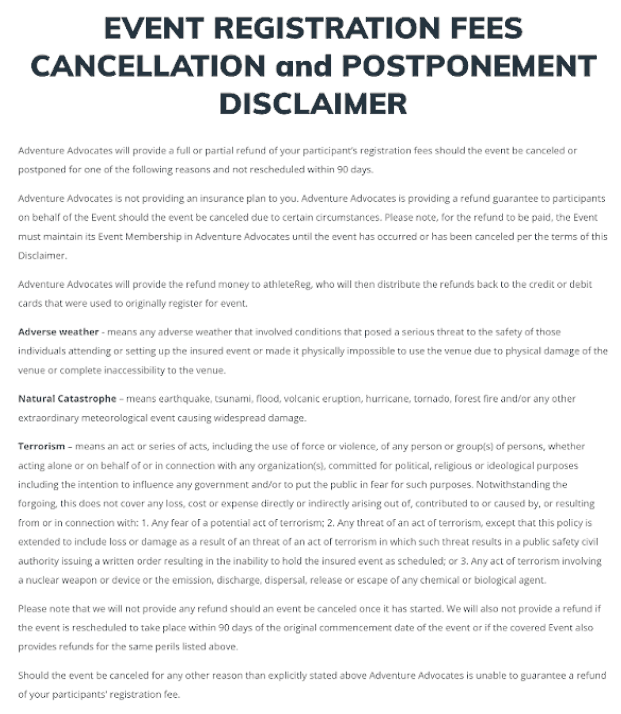 Races will be held rain, shine, sleet or snow. In the event of extreme weather or natural disaster, the ride may be shortened, postponed or canceled.